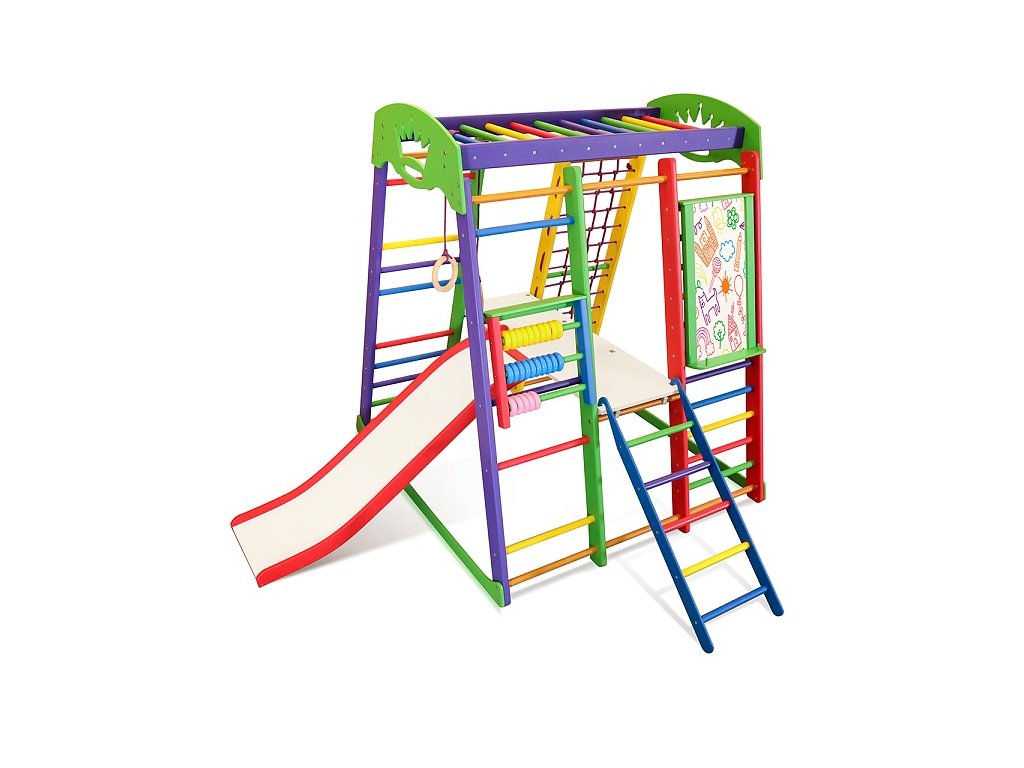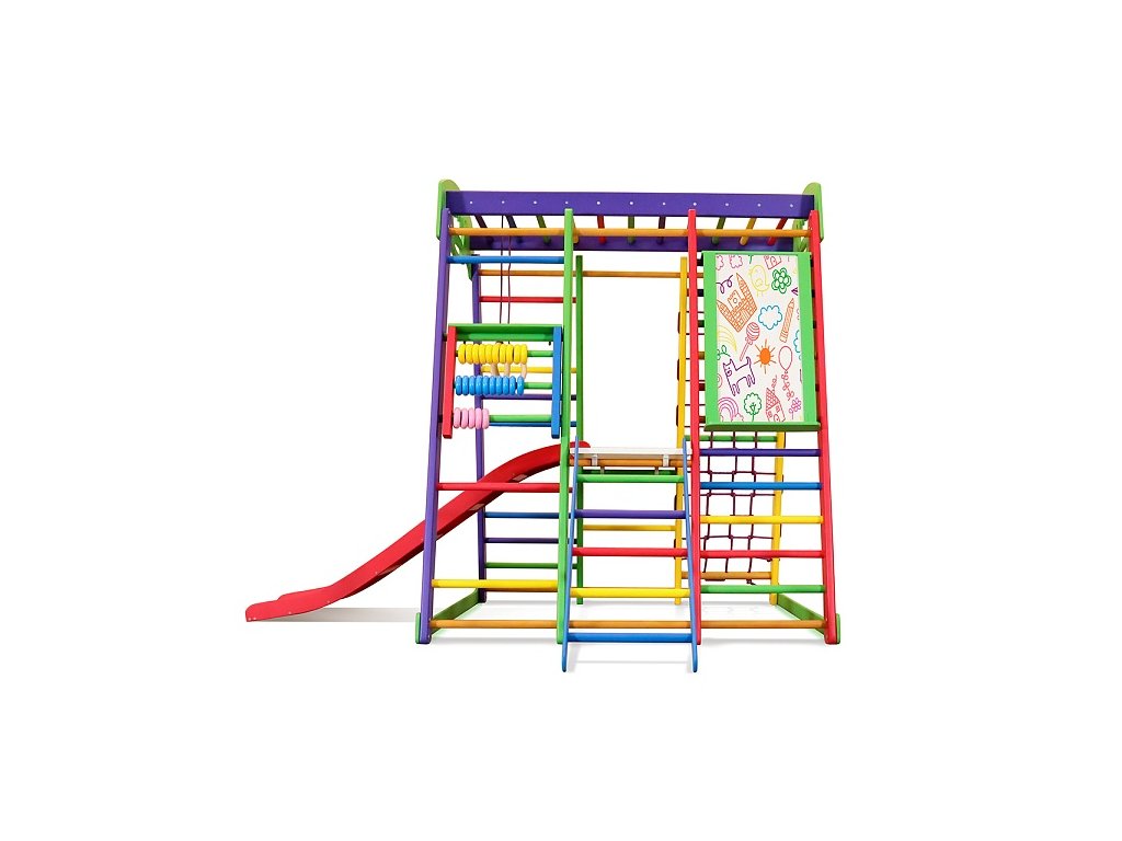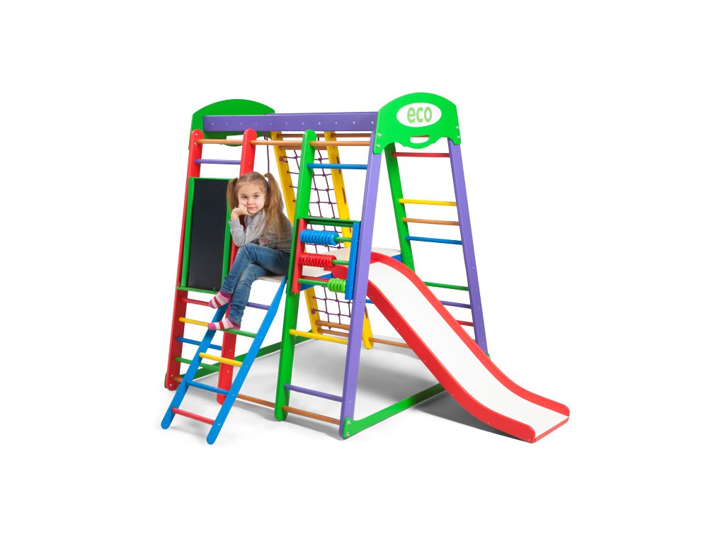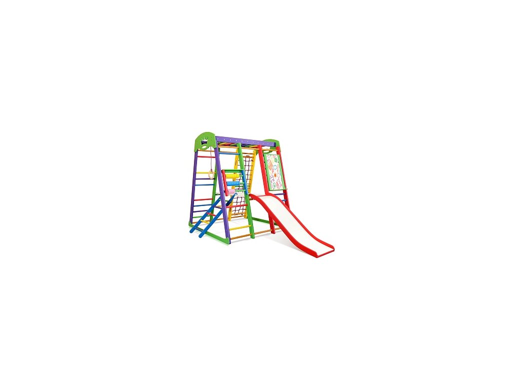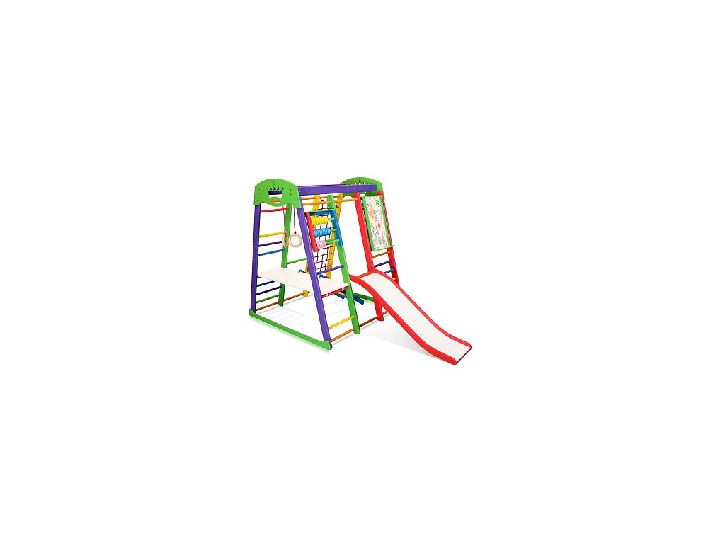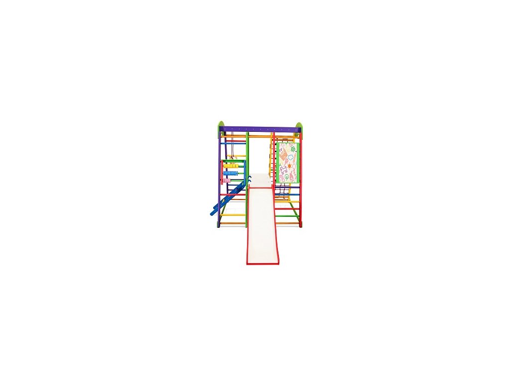 SportBaby Aquarelle Plus 3 is a sports playground for children aged 1-6 years and older. Children can learn to climb the ladder, lift themselves on poles, hang on the rings and climb the rope climbing net. This assembly allows the performance of all these elements, which are very useful for the child`s health, developing coordination and motor skills, it also provides high-quality entertainment. Pine and beech, from which the playground is manufactured, give this sport center remarkable durability. Children's indoor playground is lightweight, does not require any attachment. It is a compact, well-designed sports and gaming center, which can be transported without special effort and is quick and easy to install.