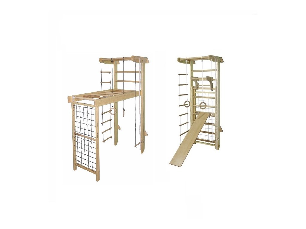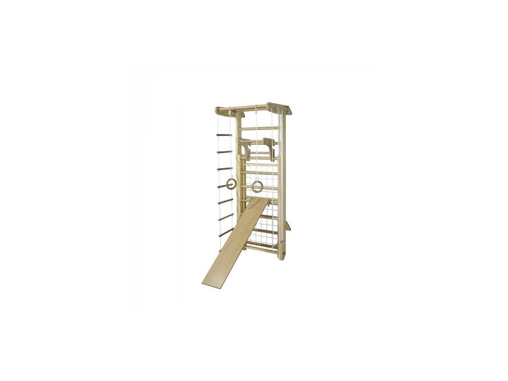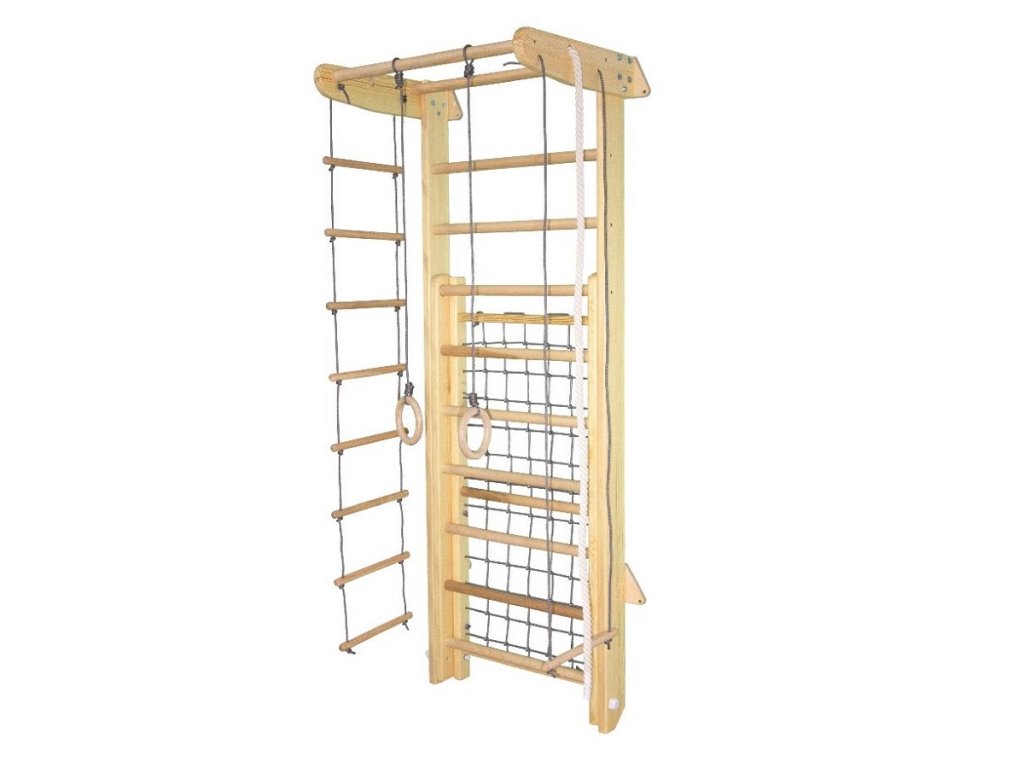 - Wide training options – wall bars, net, rings, rope, hanging bar and exercise board